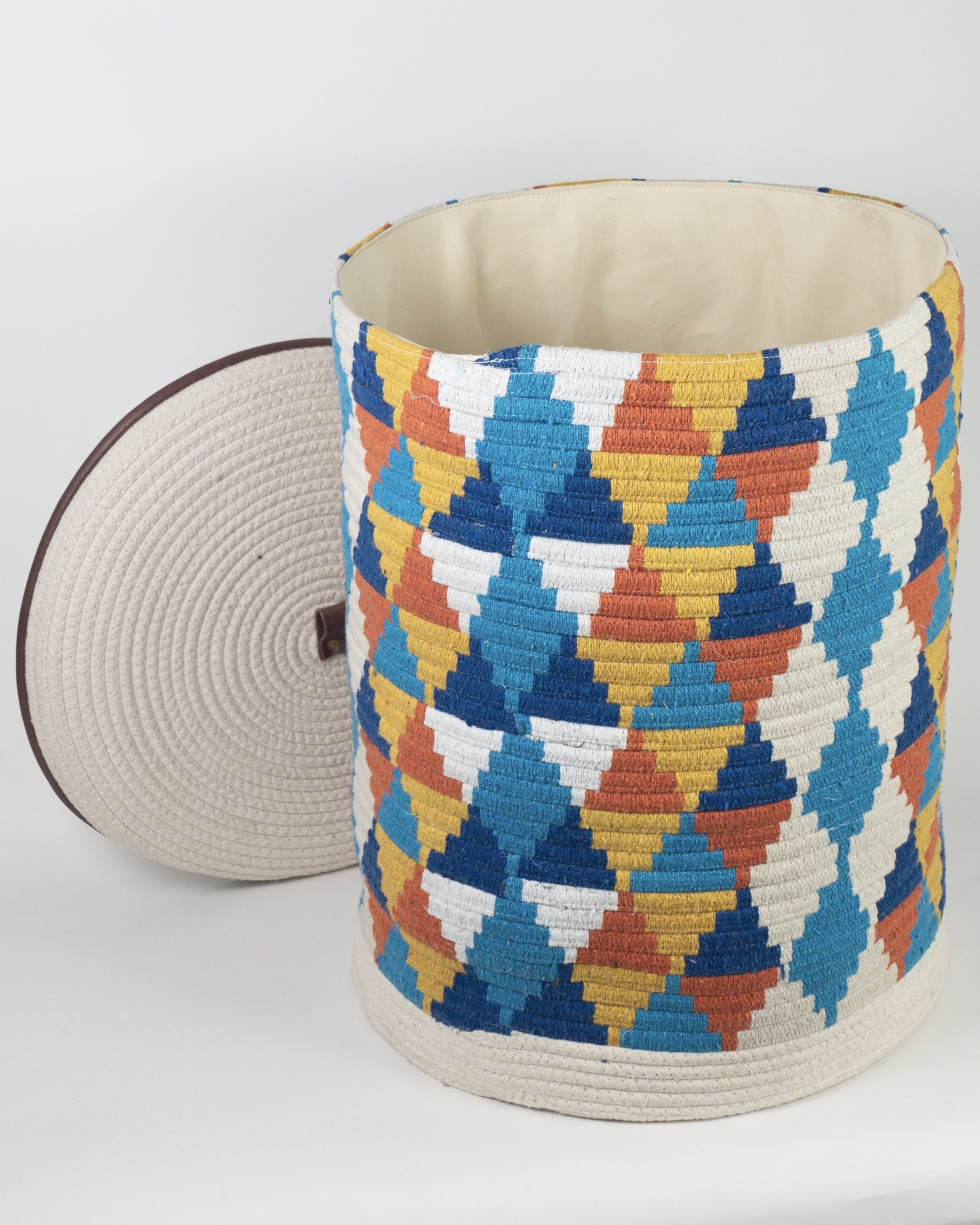MATERIAL : Natural cotton thread ropes with lid . EVA foam sheet with lining . Leather finish on lid. HANDMADE IN INDIA