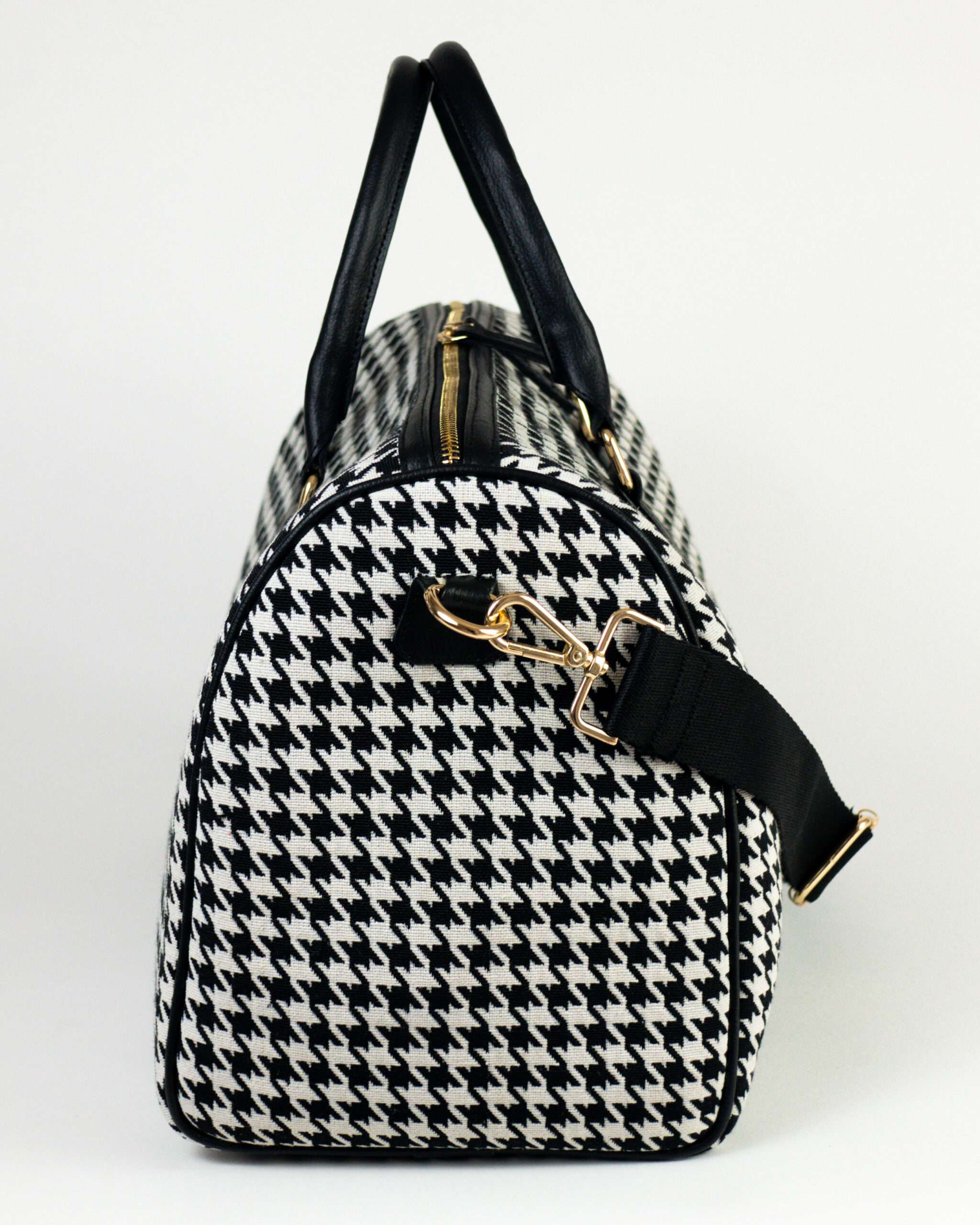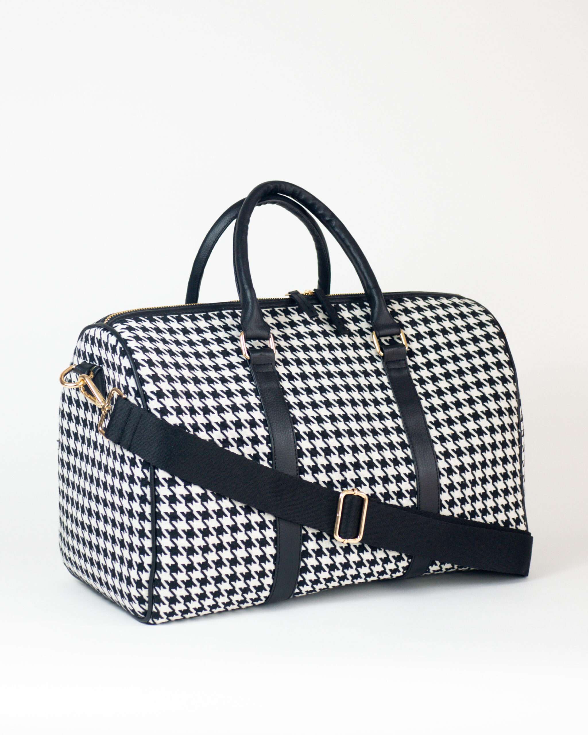 Travel Duffle Bag in a jacquard-weave cotton blend fabric with Vegan Leather handles and Gold Finish Hardware. Lining in polyester. One Zip Pocket, 2-Cut Slip Pocket Inside. Main Zip Closure Along with Adjustable Shoulder Strap