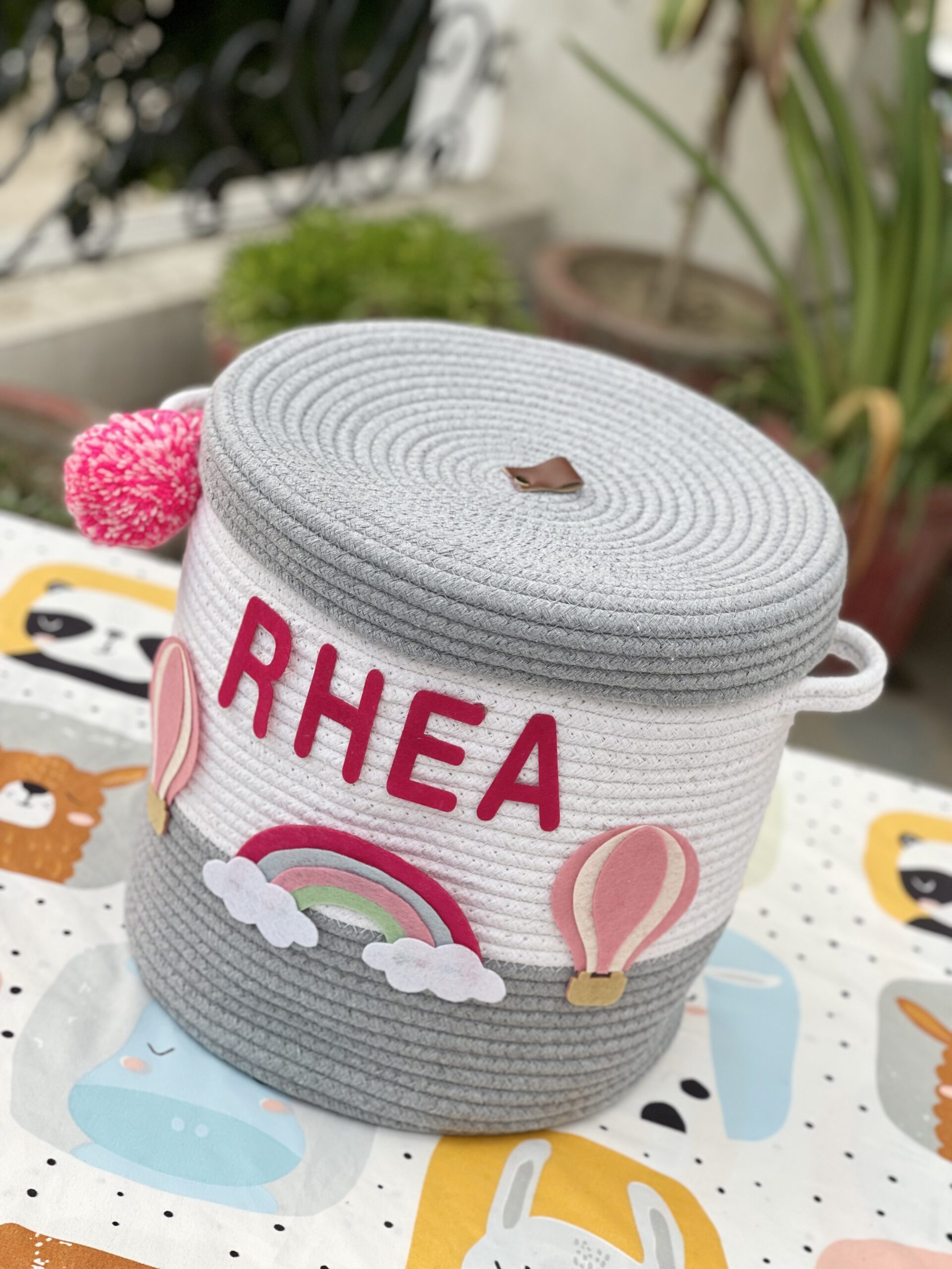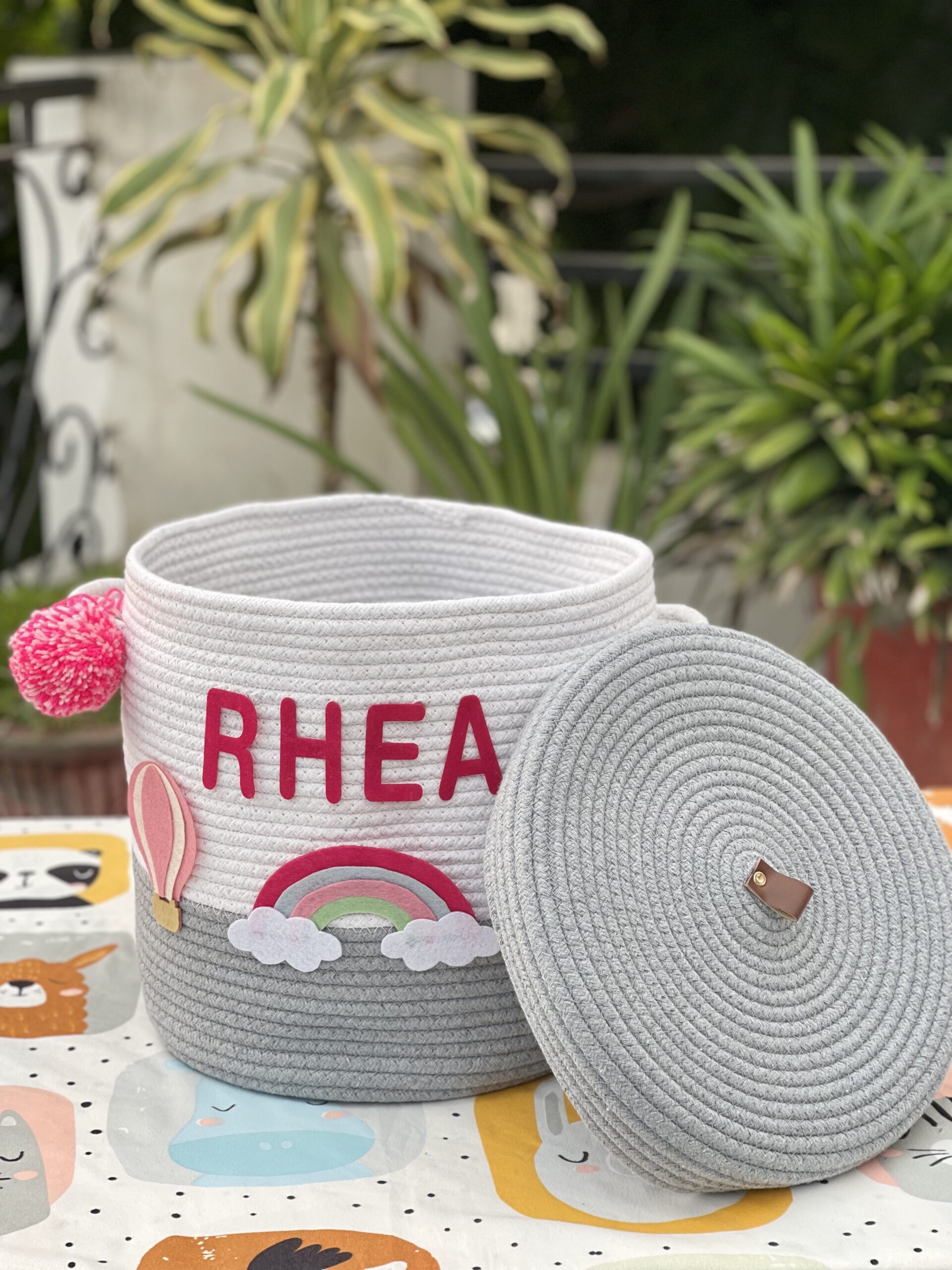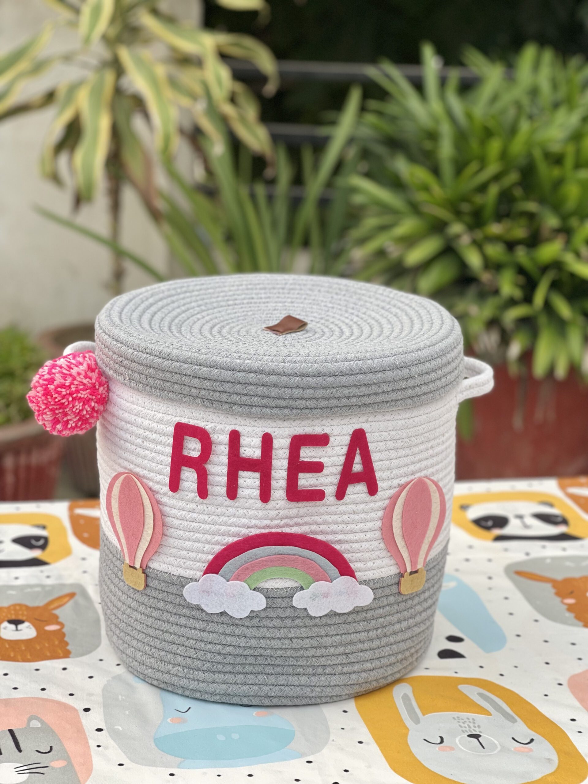 MATERIAL : Natural cotton thread ropes with woollen pom poms as well as alphabets and figure cut-outs with fine quality felt HANDMADE IN INDIA